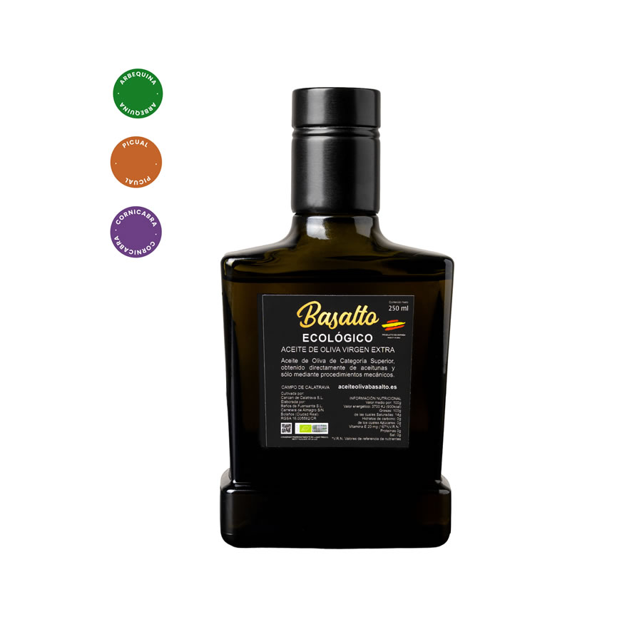 Frasco de 0,25 litros de Aceite de Oliva Virgen Extra Ecológico de categoría superior. Elaborado a partir de aceitunas seleccionadas y obtenido exclusivamente mediante procedimientos mecánicos, lo que permite conservar todo su aroma, frescura y propiedades naturales.